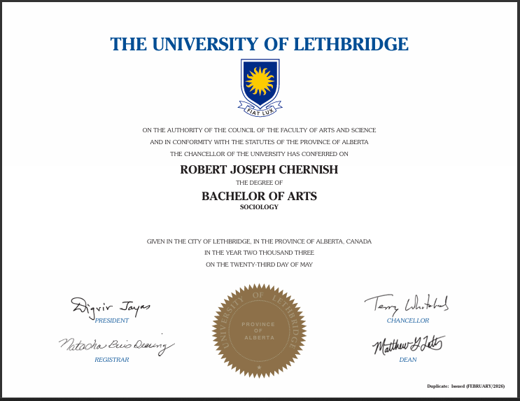 Bachelor of Arts (Sociology and English) University of Lethbridge